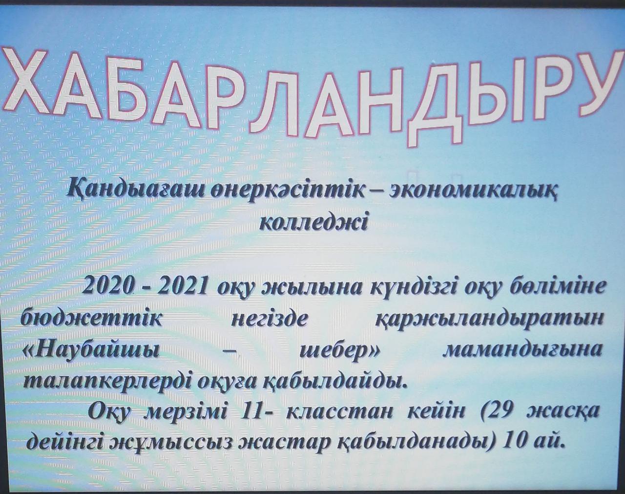 2020-2021 оқу жылына күндізгі оқу бөлімінде бюджеттік негізде қаржыландыратын «Наубайшы-шебер» мамандығына талапкерлерді оқуға қабылдайды.