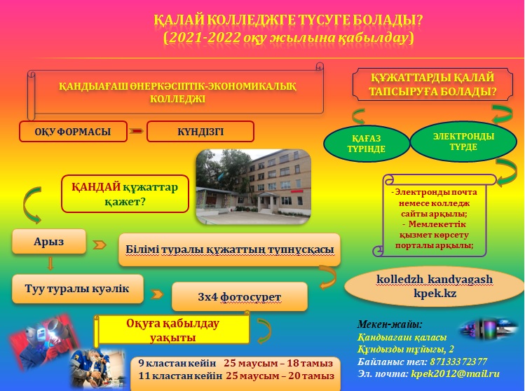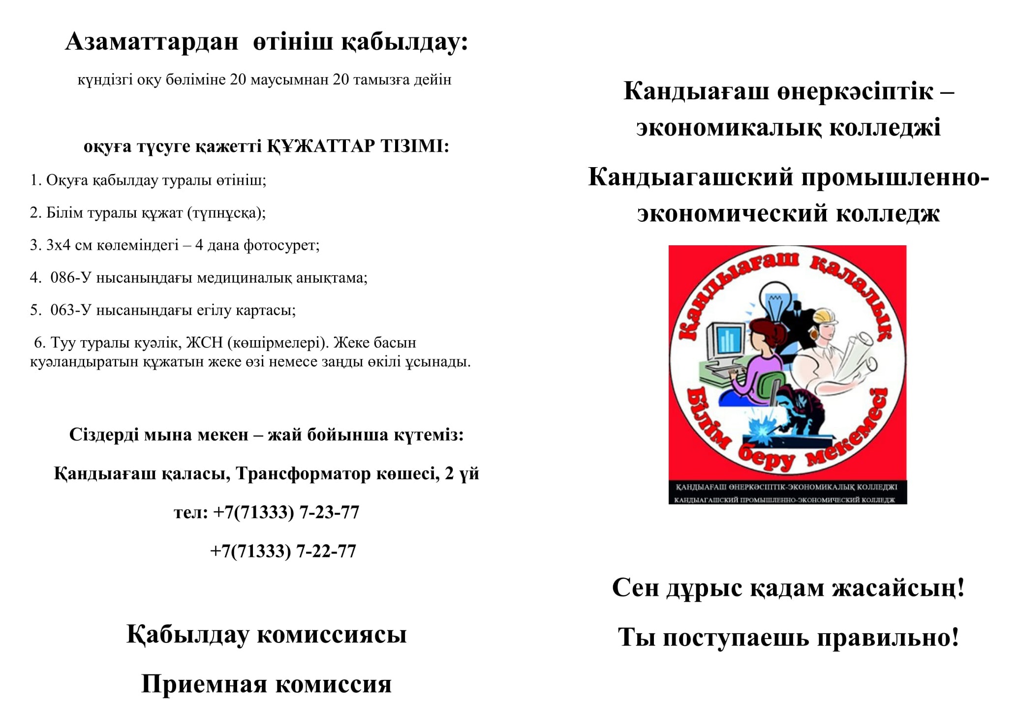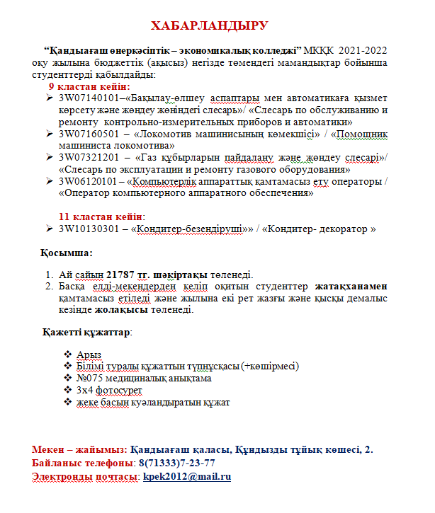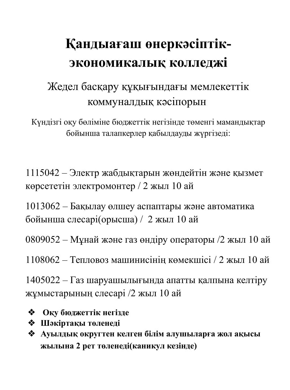 “Қандыағаш өнеркәсіптік – экономикалық колледжі” мемлекеттік коммуналдық қазыналық кәсіпорны 2018-2019 оқу жылына бюджеттік (ақысыз) негізде төмендегі мамандықтар бойынша 9 кластан кейін оқушыларды қабылдайды: