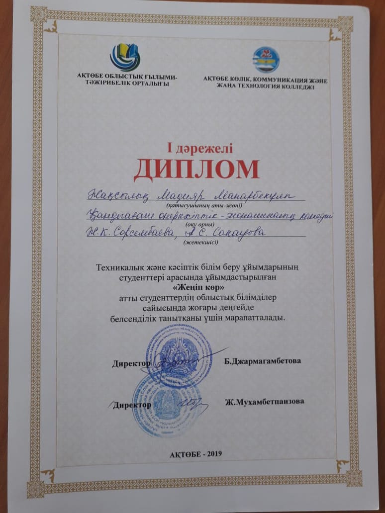 Ақтөбе қаласы "Ақтөбе көлік, коммуникация және жаңа технология колледжі" базасында өткен "Жеңіп көр" облыстық білімділер сайысында I дәрежелі дипломды иеленген колледж білім алушылары және жетекшілері Ж.Сәрсембаеваны, А.Сақауованы құттықтаймыз. 👏👏👏