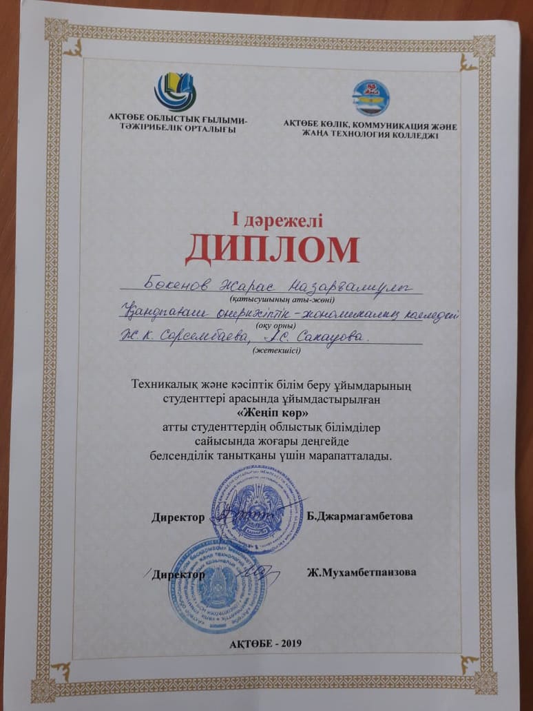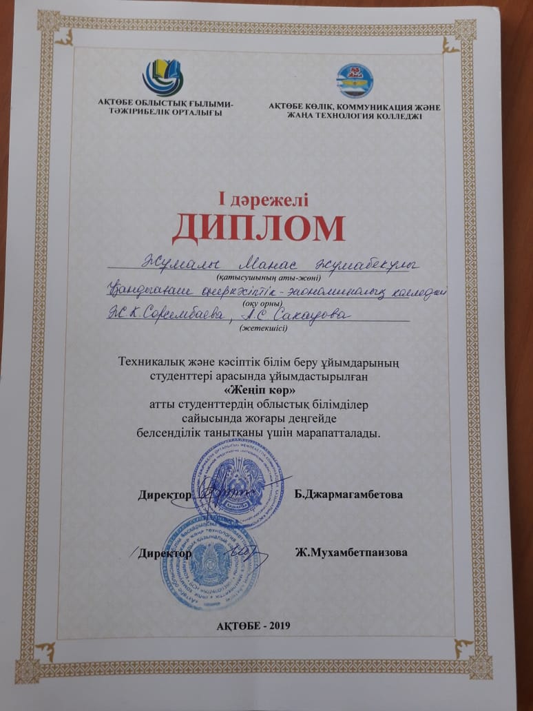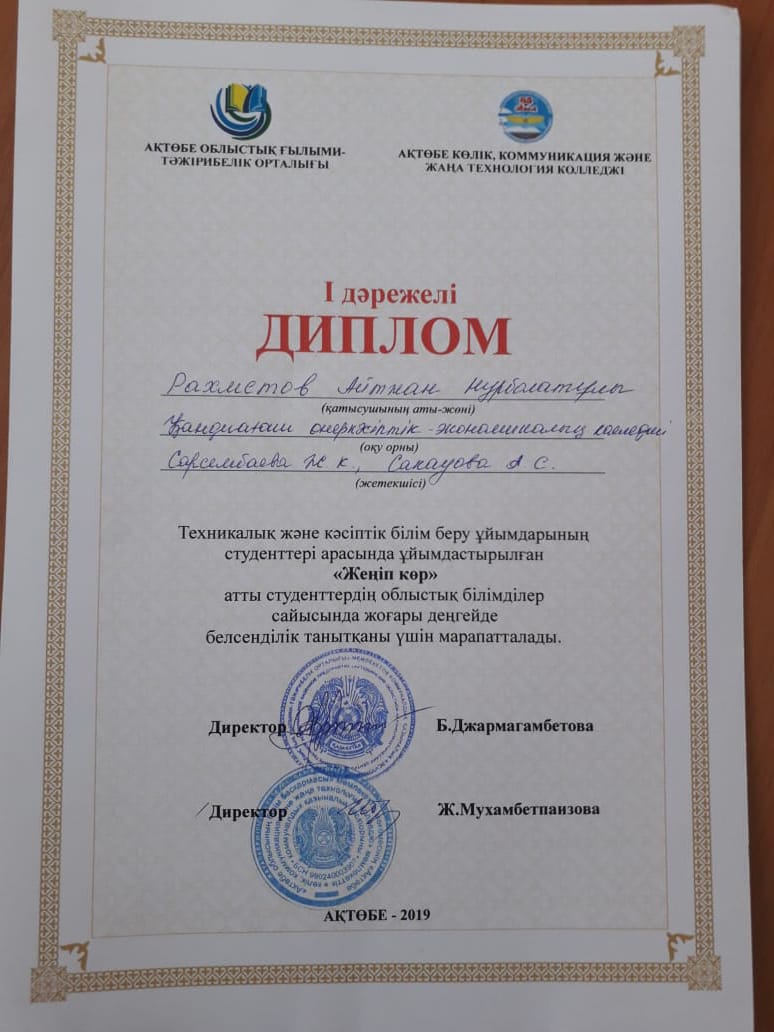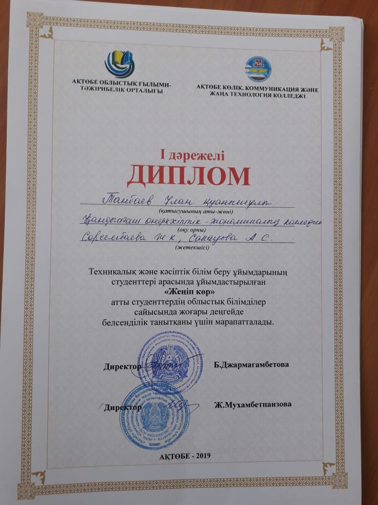 Ақтөбе қаласы "Ақтөбе көлік, коммуникация және жаңа технология колледжі" базасында өткен "Жеңіп көр" облыстық білімділер сайысында I дәрежелі дипломды иеленген колледж білім алушылары және жетекшілері Ж.Сәрсембаеваны, А.Сақауованы құттықтаймыз. 👏👏👏