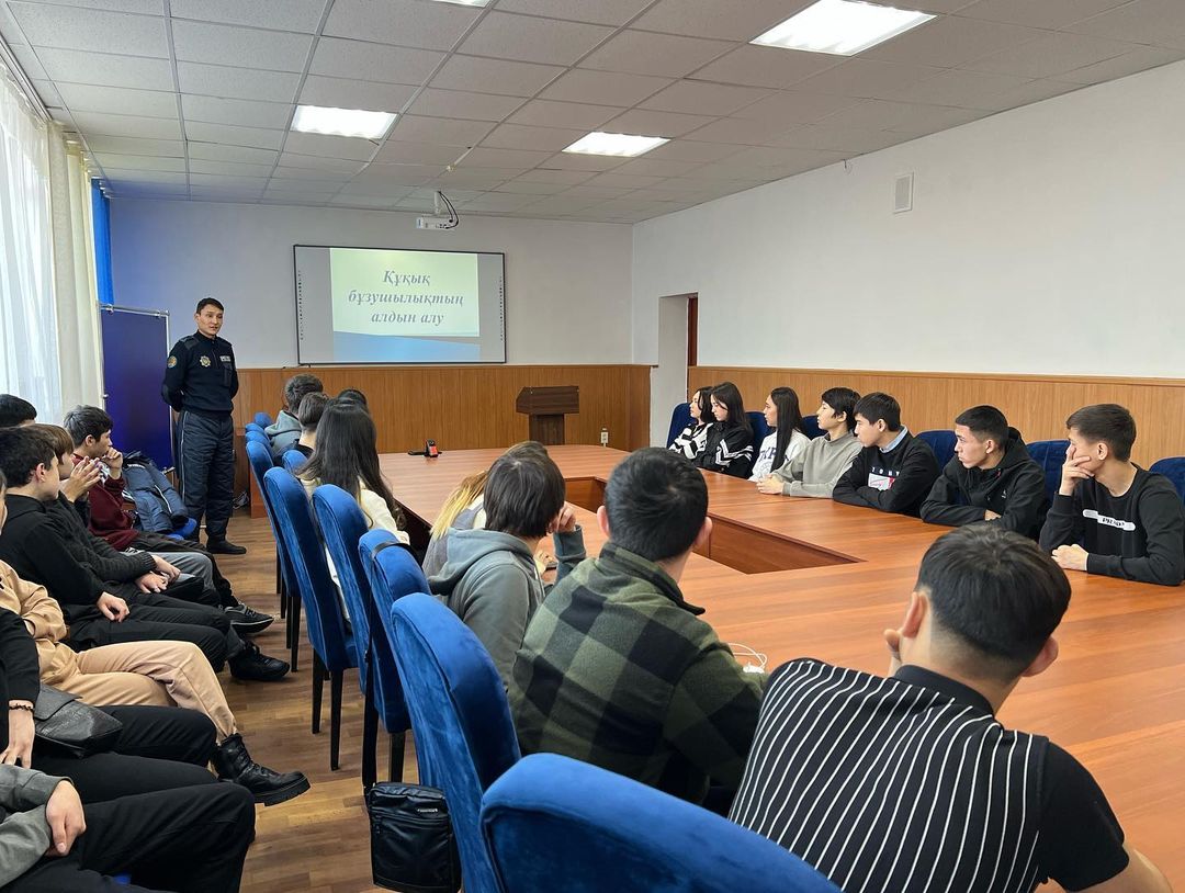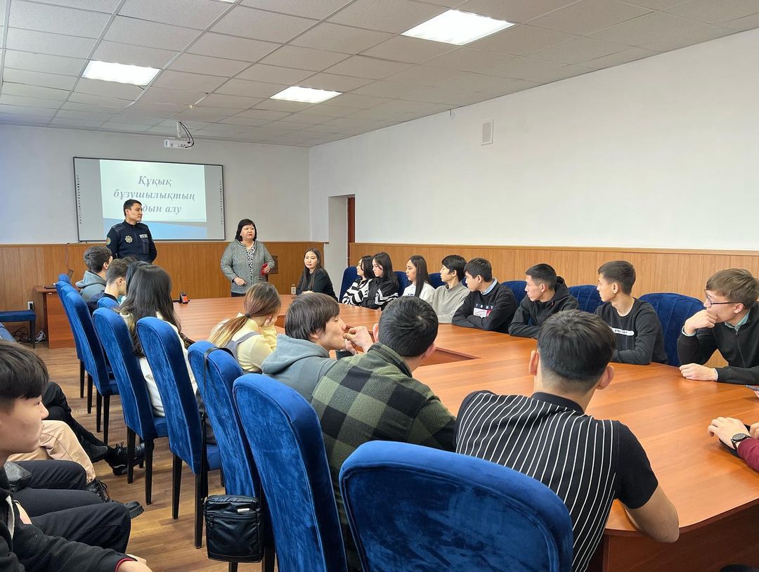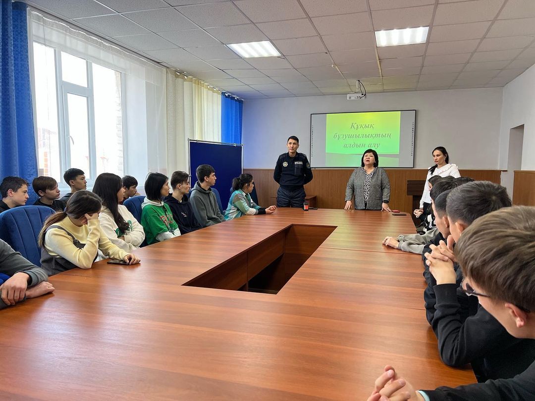 Директордың оқу жұмысы жөніндегі орынбасары М.Балымованың басшылығымен, колледж психологі А.Длимованың ұйымдастыруымен жасөспірімдер арасында құқық бұзушылықтың алдын - алу, құқық бұзушылықпен күресуде көмек көрсету, құқық тәртібін бұзуға бейім балалар қайдан шығады?, қоғамдық тәртіпті бұзған, қылмыс жасаған,тәртібі нашар, ішкі істер органдарында есепте тұрған студенттермен жүйелі жұмыс жүргізудің жолдарын шешу мақсатында колледждің кәмелеттік жасқа толмағандар ісі жөніндегі инспекторі Б.Шильдыбаевтың қатысуымен 1 - 3 курс студенттеріне ақпараттық түсіндіру жұмыстары өткізілді.