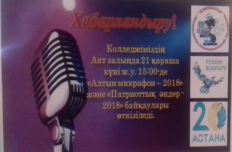 21.11.2018 года в колледже был организован конкурс "Золотой микрофон". В конкурсе приняли участие учащиеся 2-х классов: "Пародия" и "Патриотическая песня".